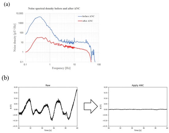 Initially, we attempted to reduce the environmental noise by applying ANC, a newly invented noise-cancelling method. The noise spectral density of the representative channel exhibited a broad range of noise reduction using ANC (Figure 3a). The noise density at 1 Hz decreased from 344.8 pT√Hz to 15.0 pT√Hz. This noise-reduction procedure could remove large amounts of noise emitted from the surrounding magnetic materials and geomagnetic fields. The representative waveform of the magnetic signal exhibited an alternation of the waveform caused by environmental noise, which was eliminated by the application of ANC (Figure 3b).