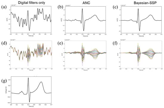 The signal-averaged MCG waveform from a single representative channel through each stage of signal processing illustrates a progressive reduction in noise (Figure 4a–c). After the application of the digital filter alone, the raw waveform exhibited considerable noise contamination (Figure 4a). The application of ANC substantially reduced the background noise, enabling the visualization of the QRS complex and T waves; however, P waves with small amplitudes were unclear (Figure 4b). The application of Bayesian SSP further eliminated the residual noise component and flattened the baseline of the waves, enabling detection of the P wave (Figure 4c). Compared to a simultaneously recorded ECG, the application of our noise reduction methods made the MCG waveform of comparable quality as the QRS complex. However, the P and T amplitudes were smaller in the MCG than in the ECG (Figure 4c,g). The waveforms of all 42 channels overlapped (Figure 4d–f), indicating that noise reduction was achieved in all channels.
