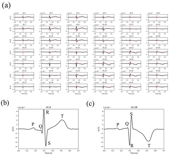 Waveform array of MCG after the noise reduction process. (a) Waveforms of each magnetoresistive sensor are displayed in the configuration of the sensor array. (b,c) Enlarged waveforms of representative channels selected from the waveform array. Waveforms of Ch. 9 (b) and Ch. 28 (c) are exhibited. The component of the wave (P, Q, R, S, and T) is indicated in each figure.