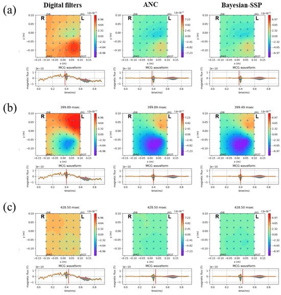 Isomagnetic field maps after noise reduction processes. Isomagnetic field maps are shown at the timing of the Q-waves (a), R-waves (b), and the end of the QRS complex (c). Each image was constructed using MCG waveforms after digital filters (left), application of ANC and signal averaging (center), and further application of Bayesian SSP (right), respectively.
