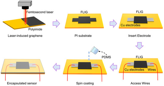 To ensure accurate response and stable temperature sensing, the active region of the flexible sensor was designed as a rectangular pattern to facilitate uniform heat distribution. The conductive layer was formed using femtosecond laser-induced graphene (FLIG), followed by the application of conductive silver paste and the insertion of copper sheet electrodes at both ends to establish electrical connections. The core sensing unit was entirely fabricated using femtosecond laser direct writing (FLDW), a technique that offers high structural continuity, simple processing, and patterning flexibility. As illustrated in Figure 1, the preparation of a flexible temperature sensor based on femtosecond laser direct writing (FLDW) technology is a complex process. The device’s fundamental structure comprises a PI flexible substrate, a FLIG sensing layer, a silver paste electrode, a copper conductive sheet, and a PDMS encapsulation layer. The device exhibits advantageous flexibility, thermal stability, and conductivity characteristics. In the pre-processing stage, the PI film is first cut into square sheets measuring 3 cm × 3 cm. Then, the surface is thoroughly cleaned with anhydrous ethanol to remove impurities, including electrostatically adsorbed dust, oil, and particles. This ensures the cleanliness and consistency of the laser processing area. Subsequent to the cleaning process, it is imperative to allow the surface to undergo natural drying. This is to ensure that the residual solvent does not exert an adverse effect on the laser induction efficiency.