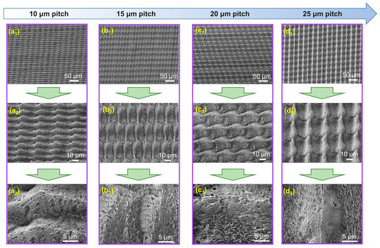 On the basis of the above standardized preparation process, this study further investigated the effect of laser scanning spacing on the formation quality and microscopic morphology of FLIG structures. To ascertain the effects of varying scanning spacings (10 μm, 15 μm, 20 μm, and 25 μm) on the formation of FLIG, the surface structures of these samples were systematically compared. This was achieved by maintaining the laser power, scanning speed, and other parameters at constant levels. The evolution patterns of the samples were observed by multi-scale scanning electron microscopy (SEM), as shown in Figure 2. As evidenced by the low magnification plots (Figure 2(a1–d1)), it can be observed that a decrease in scanning pitch results in an increase in the overlapping area between the laser scanning paths, thereby forming a more continuous and denser FLIG pattern. The patterns formed under the 10 μm and 15 μm spacing conditions are uniformly aligned, and there are no obvious gaps between the carbonized regions. This indicates that the superposition of the energy of the laser acting on adjacent paths promotes the full development of the graphitization process. Conversely, when the scanning spacing was increased to 20 μm and 25 μm, evident discontinuities manifested between the FLIG patterns, characterized by distinct boundaries and a less organized arrangement between the carbonized bands. This finding suggests that sufficient structural remodeling did not occur on the PI surface within the laser-uncovered region, resulting in sparse conductive paths and diminished connectivity.