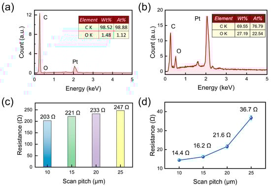 Furthermore, Figure 3c presents the initial resistance measurements of the prepared FLIG films at varying scanning spacings (10, 15, 20, and 25 μm). The resistance value undergoes an incremental rise from 203 Ω (10 μm) to 247 Ω (25 μm) as the scanning pitch is increased. This increase in resistance value is primarily attributable to the fact that the FLIG structure becomes sparser at larger scanning spacings, thereby disrupting the continuity of the conductive network and consequently increasing the overall resistance. As illustrated in Figure 3d, the outcomes of the four-probe resistance measurements at varying scanning spacings are presented. The results demonstrate that there is an increase in resistance from 14.4 Ω to 36.7 Ω. This enhancement in resistance can be attributed primarily to the augmented scanning spacing, which consequently diminishes the laser scanning overlap area. This, in turn, results in an incomplete induction of graphene on the PI surface. Consequently, the conductive network in the FLIG region becomes inhomogeneous, resulting in elevated resistance. This result further emphasizes the critical role of scanning spacing in influencing the degree of graphitization and overall conductivity of laser-induced graphene. This finding is highly consistent with the results of the aforementioned SEM morphology analysis, which further confirms the important role of scanning pitch as a key process parameter in regulating the conductivity and microstructural integrity of FLIG.