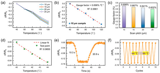 In order to verify the thermal response characteristics of the constructed flexible temperature sensors, the relative resistance change behavior (ΔR/R0) of the devices at different scanning spacings was systematically measured over a temperature range of 40–120 °C. The temperature response curves of the devices are shown in Figure 4a. The temperature response curves for four sets of samples with scanning spacings of 10 μm, 15 μm, 20 μm, and 25 μm, respectively. All the devices under scrutiny manifest typical negative temperature coefficient (NTC) characteristics; that is to say, the resistance value undergoes a gradual decrease in conjunction with an increase in temperature. This phenomenon is primarily attributable to the thermal excitation of the FLIG material during the temperature rise process. This process has been shown to enhance carrier mobility and interface conduction effect, thereby reducing the overall resistance. A thoroughgoing comparison reveals that the samples with 10 μm and 15 μm spacing exhibit larger response amplitude and better linearity. This finding suggests that the dense and uniform FLIG structure is more conducive to the construction of a continuous and stable conductive network, which in turn improves the response sensitivity to thermal excitation. This outcome is consistent with the aforementioned SEM morphology analysis, which further verifies the synergistic effect of smaller scanning spacing in structure optimization and performance enhancement. Furthermore, the linear fitting of the temperature response curve (Figure 4b) demonstrates that the 10 μm sample demonstrates a gauge factor of up to 0.698% °C−1 with a goodness-of-fit R2 of 0.9961, indicating that it exhibits excellent and predictable thermal response properties. The sensitivity coefficients at varying scanning spacings are compared in Figure 4c, and the results demonstrate that the sensitivity significantly increases with decreasing scanning spacings, thereby further confirming the critical role of the uniformity and connectivity of graphene networks in determining thermal response performance at reduced spacings.