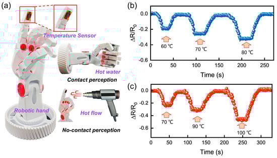 As demonstrated in Figure 5a, the sensors were integrated onto the fingertip surface of the robotic hand and connected to the external data acquisition module via flexible wires. In the contact sensing test, the sensor was integrated into the robotic finger’s abdomen, and the acquisition of thermo-tactile signals was realized by directly grasping hot water glasses of varying temperatures (Figure 5b). As the temperature of the heat source increased from 60 °C to 80 °C, the resistance changes in the sensor output (ΔR/R0) remained stable and increased in a stepwise manner, indicating that it was able to accurately differentiate between the intensity of different contact heat sources. This stable and graded response characteristic indicates that the device not only possesses good temperature sensitivity but is also suitable for practical thermal contact monitoring scenarios with certain quantitative discrimination capability. Furthermore, non-contact thermal sensing experiments simulated heat flow field perturbations by blowing air into the surface of a mechanical finger with a hot air gun, with a 10 cm distance between the sensor and the heat source (Figure 5c). Despite the absence of direct contact with the heat source, the sensor demonstrated a swift and consistent response to temperature fluctuations, exhibiting a high degree of reproducibility in its output signals. This response was observed under conditions of hot air stimulation ranging from 70 °C to 100 °C. This ability to respond to heat flow perturbations over long distances is of particular importance for the development of smart terminals with “forward sensing” capabilities.