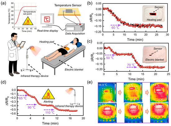 In order to provide further validation of the utility of FLIG flexible temperature sensors in medical and healthcare scenarios, a set of application demonstrations was designed in typical thermal therapy environments. These environments included electric heating pads, electric blankets, and infrared physical therapy devices. These devices are widely used in clinical rehabilitation, chronic pain management, and postoperative repair, where they enhance local blood circulation and tissue repair through mild heating. However, temperatures over 45 °C or prolonged exposure to low-temperature heat sources (38–45 °C) can result in scalding or low-temperature burns, which pose a heightened risk for elderly, unconscious patients. Consequently, it is imperative to acknowledge the significance of real-time temperature monitoring and the implementation of intelligent warning systems during thermal therapy. As demonstrated in Figure 6a, the FLIG sensor’s thin structure and bendable characteristics enable seamless integration into wearable platforms, such as electric heating pads, electric blankets, and rehabilitation suits. During operation, the resistance change induced by thermal stimulation is continuously converted into an electrical signal and transmitted to a computer via a data acquisition interface, thereby enabling real-time temperature monitoring and risk warning.