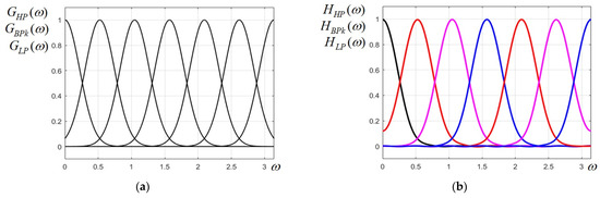 Next, scaling parameter p has to be calculated for the specified bandwidth value. For our purpose, the filter bandwidth is defined at 0.5 of the peak value (at 6 dB). The magnitude characteristics of any two consecutive, adjacent filters partially overlap and intersect at the value 0.5. Considering the LP filter given by , we apply the condition , also written ; thus, the value of scaling parameter p is . Since the bandwidth of each component filter is , we obtain the scaling parameter value . The ideal uniform Gaussian filter bank is plotted in Figure 1a. For a very accurate approximation and a small ripple level, the Fourier series given by (1) and (2) was truncated at a number of N = 12 terms. The approximation order must be a trade-off between a small distortion level and a reasonable size of the filter matrices for a convenient implementation.