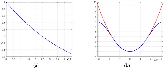 This approximation is plotted as the blue curve in Figure 2b, while the exact function is plotted in red. It can be noticed that the approximation is very accurate at least on the interval , and it tends to diverge visibly towards the margins of the interval.