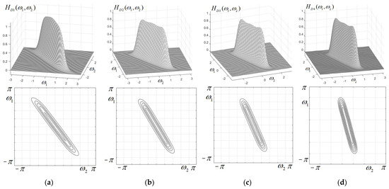 The next design step is to substitute Relations (22)–(24) into (13), obtaining an expression of which is then introduced in (20); finally, a trigonometric expression of the function in the variables and is determined. Considering this two-variable function as a 2D discrete Fourier transform, by directly identifying the corresponding coefficients, we finally reach a matrix of size , with the general form, symmetric with respect to the central element: