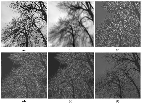 In this section, we show a useful application of the uniform elliptically shaped FIR filter bank designed through the proposed analytical technique. The following simulation will be performed on a grayscale test image of size shown in Figure 5a, representing some branches of trees without foliage in winter time. This particular test image was chosen due to its structure of fine details, represented by the tree ramifications. The image was filtered by passing it through the six components of the filter bank (one low-pass filter and five band-pass filters). In this case, the elliptical uniform filter bank actually decomposes the test image into sub-band images, thus behaving as a usual analysis filter bank. The original image shown in Figure 5a is first low-pass filtered by the filter , which has a relatively narrow bandwidth, both transversally and longitudinally, for the specified values of the ellipse semi-axes. Figure 5b showing the output of the LP filter is very blurred, and the fine details, like thin twigs, can be no longer distinguished. Next, Figure 5c–f showing the outputs of the first four band-pass filters contain specific details, with higher and higher frequencies, corresponding to the selected region from the frequency plane.