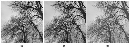 Image analysis using the elliptically shaped filter bank: (a) original “Trees_in_winter” image; (b) LP-filtered; (c–f) BP-filtered with BPF1, BPF2, BPF3, BPF4, respectively; (g,h) recovered image by summing first 2 and 3 components; (i) recovered image by summing all 7 components (sub-band images).