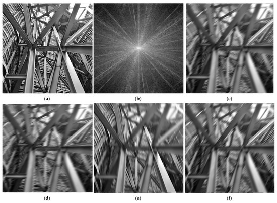 Let us consider the image of size 690 × 690 pixels shown in Figure 7a, representing a structure of metallic beams, seen in perspective. This image is relevant for our directional filtering example, as it contains many straight lines oriented in various directions.