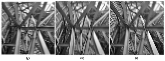 Applying a very selective Gaussian elliptical filter, like the ones shown in Figure 4, with various orientation angles (as specified in the figure), the filtered images in Figure 7c–g are obtained. For a specified orientation of the filter, different straight lines (various edges of metallic beams and other linear details) are outlined, while others are more or less affected by blurring, depending on the angle of orientation.