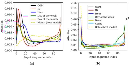 The aforementioned initial peak is especially exaggerated in the best model (i.e., the one that introduces the bolus insulin), where the first sample presents a value around 10 times higher than most of the middle part of the sequence. This shows that, although insulin bolus as input improved model performance, the context that comprises the full sequence has not been properly learned, as evidenced by metrics reported in Table 3. This might be related to the fact that the models are fed with only 8 h of data against the 24 h sequence of the WARIFA dataset. Apart from this abrupt difference, the attention of the best model presents the smoothest curve, showing a gradual increase at its end (i.e., more recent values), as could be expected. Furthermore, even though attention curves of all generated models increase at the end of the sequence, this change is especially abrupt in some of the worst-performing models (when including ID and the day of the week). On the contrary, the attention of the best three models (when hour, carbohydrate intake and insulin bolus are introduced) presents a similar pattern: a peak at the beginning of the sequence, balanced attention in its middle part, and increased attention at its end. The differences in the attention values in the middle and end of the attention vector are mainly determined by the initial peak (i.e., the attention associated with the first samples). Namely, larger peaks “leave” less attention for the rest of the sequence. The observed attention pattern suggests that the models present limitations in leveraging the information embedded in the whole input sequence. In these experiments, a smooth balanced attention pattern, such as the one depicted in Figure 1a for the best model of the WARIFA dataset, was not seen. This suggests that more balanced attention within the input sequence might be associated with better prediction performance.