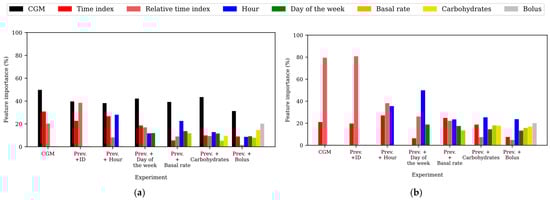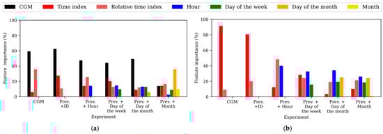 To gain insights into the relevance of the input features in the predictions, the feature importance within the different experiments training the TFT was assessed for the WARIFA and OhioT1DM datasets, as shown in Figure 2 and Figure 3, respectively. Notice that feature importance may vary from the TFT encoder, which learns the context and data patterns, and the TFT decoder, which generates the output sequence after having learned from the input data. As with the attention, feature importance barely varies within PHs, so the feature importances corresponding to the first predicted sample have been analyzed, being representative of the whole model. Additionally, ID does not appear in this analysis, since it is the only static covariate included in this study and its relevance cannot be compared with time-varying features. In this comparison, the time index refers to the position of a given sample within the input sequence with respect to the moment of the prediction, whereas the relative time index refers to the time index of a given sample with respect to the rest of the samples present in the input sequence. Furthermore, the variable CGM reading is not present in the TFT decoder, since it is the target variable (i.e., the prediction itself).
