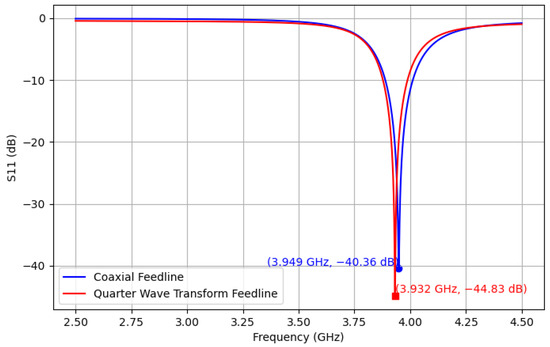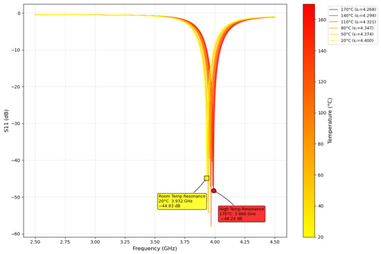HFSS ANSYS (2024 R2) [48] simulations were used to verify the estimated theoretical resonant frequency of 4.0 GHz. Two feedline configurations were modeled in HFSS ANSYS: (1) quarter-wave transformer and (2) coaxial. The final design iteration of the patch sensor used in this work is shown in Figure 2. Antenna characterization results showed a resonant frequency of 3.949 GHz from the coaxial feedline and 3.932 GHz from the quarter-wave transformer, as shown in Figure 3. Radiation simulations showed a dBi of 4.18 at the main lobe of the system. The quarter-wave patch antenna’s changes under temperature from 20 °C to 170 °C were simulated by parametrically changing the dielectric constant using the TCD of the substrate, as shown in Figure 4. Ensuring a 50 impedance match was essential for accurately estimating the TM10 resonant frequency along the patch length.