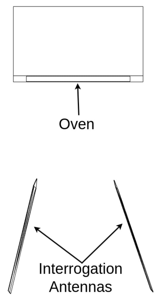 The interrogator antennas used were a pair of RFSPACE TSA600 Ultra-Wide Band log-periodic antennas with 12 dBi gain at 4 GHz. The interrogator antennas were positioned adjacent to the oven opening at variable distances from a sensor and were connected to the VNA using 0.3 m coaxial cables. Both the interrogator antennas and the patch sensor were linearly polarized with the electric field oriented vertically (co-polarized), and the port plane was defined at the antenna–cable junction. This polarization and orientation setup was maintained consistently across all test configurations. Short-Open-Load-Through (SOLT) calibration ensured measurement accuracy.