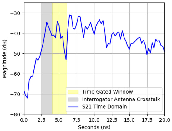 Accurate characterization of the patch antenna’s response required isolating its signal from environmental reflections and interrogator antenna crosstalk. Multipath interference and background reflections in ovens with complex geometries obscured the true resonance behavior of the sensor. Time-domain processing offered a means to distinguish between reflections based on their propagation delays, allowing for selective extraction of a sensor’s backscattered signal. The interrogator antenna at the VNA port 1 transmitted a signal toward the patch antenna, which reflected it back toward the antenna at the VNA port 2. Signals at the patch antenna’s resonant frequency were absorbed and re-emitted over a delay of approximately 100 ns, preventing them from reaching the VNA port 2 within the 8 ns time window typically associated with direct reflections. Reflections from background objects introduced additional noise into the final measurement. Time-gating mitigated these unwanted reflections, isolating the patch antenna’s response and reducing noise [4,8,11,12], as shown in Figure 7. The first reflection on the time-domain signal resulted from crosstalk between the interrogator antennas. The second came from backscattering off the patch antenna, and subsequent reflections originated from the oven interior and surroundings. Gaussian windowing with a standard deviation of 0.4 was applied to the signal to isolate the desired portion.