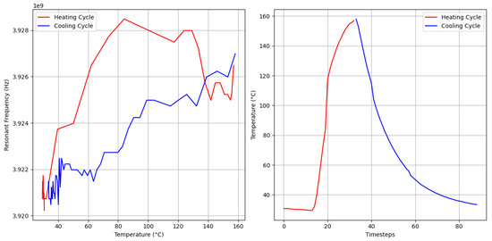 Hysteresis of the sensor: The sensor underwent rapid temperature change, showcasing the hysteresis effect. Plot on the left shows how resonant frequency changes with time. Plot on the right shows the rapid temperature changes.