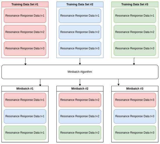 Raw data collected from the LibreVNA lacked structure and required processing to extract meaningful features for model training. Unstructured data was processed and organized using the data historian, which allowed for feature extraction, live data analysis, and model training. Inconsistent input ranges in the raw feature data hindered model convergence and prediction stability. Data preprocessing was used to prepare the datasets for machine learning models and refine the raw data collected from the LibreVNA. Preprocessing steps included minibatching, timestepping, and scaling. Minibatching shuffled chunks from multiple datasets, as shown in Figure 9, which prevented overfitting on the final dataset within an epoch and improved model generalization across all datasets. Timesteps were implemented for the LSTM by including 15 previous points per sample, with earlier data points in a dataset (N < 15) being truncated. Normalization was required to ensure that all input features contributed proportionally during training and inference, preventing features with larger numerical ranges from dominating the learning process. Features with bounded, monotonic behavior were normalized using MinMax scaling to ensure consistent input ranges between 0 and 1 for model training, as summarized in Table 2. MinMax scaling was preferred over standard scaling because the features exhibited linear trends rather than mean-centered distributions, making MinMax scaling more effective at preserving trend information critical to model performance.