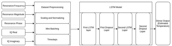 The LSTM and NN used the TensorFlow library to integrate with the rest of the data processing pipeline. Hyper-parameters, which were variables that described the overall structure of the model, were adjusted heuristically using Bayesian optimization to enhance the model’s performance and minimize the Mean Absolute Error (MAE). Some examples of these hyper-parameters include the LSTM model sizes (neuron percentage, neuron shrink), learning rate, kernel regularizer, and dropout layer percentage, as shown in Table 3. The final model architecture consisted of six layers. The first layer was an input layer with a shape of . The number of timesteps for these tests was 15. The features fed into the models were normalized resonant frequency, resonant magnitude, resonant phase, and IQ data (imaginary and real). The first LSTM layer had 213 neurons, the second had 49 neurons, and each layer used the tanh activation function to promote profiling of non-linear functions. The l2 kernel regularizer of the model was set to