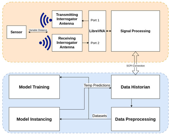 The complete interrogation and model training pipeline is shown in Figure 11, with sensor interrogation in orange and dataset processing in blue. The top section depicts the physical interrogation setup, where a passive wireless sensor is positioned at a variable distance from a pair of interrogator antennas. The transmitting antenna connects to port 1 of the VNA, while the receiving antenna connects to port 2. The system interrogates the sensor wirelessly by sweeping a range of frequencies and measuring the transmitted signal response, which is processed using time-gating. Signal features are forwarded to the data historian using a Standard Commands for Programmable Instruments (SCPI) connection. The historian stores the incoming data and forwards it to a preprocessing stage, which cleans and formats the signal for ML workflows. Processed datasets are used to train models, which generate temperature predictions from incoming data. Predictions are looped back into the historian for further validation and monitoring.