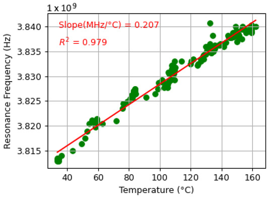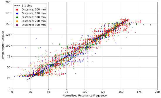 where f was the resonant frequency at any given temperature, was the resonant frequency at 0 °C and m was the slope of the frequency change per degree Celsius, also known as the sensitivity, which is computed per dataset. The normalized frequencies versus temperatures for all 28 datasets are shown in Figure 12. The system required configuration before live instancing by determining the resonant frequency at two known temperatures due to the use of the normalized resonant frequency.