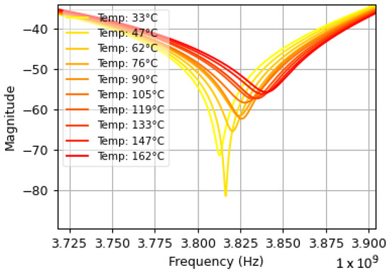 Each dataset consisted of a sensor’s resonance response as it was subjected to temperatures varying between 20 °C and 170 °C. Some datasets captured sensor cooling, while others captured sensor heating. Variations in temperature acceleration, sudden jumps in temperature, and slow periods of heating and cooling were included to provide the model with a more general understanding of a real-world boiler system. Each dataset demonstrated a linear correlation between the resonant frequency of the patch antenna and the temperature recorded by the thermocouple. Sample data interrogated from the original patch antenna sensor [1] is shown in Figure 13 and Figure 14, where Figure 13 illustrates the readings at various temperatures, and Figure 14 shows how the resonant frequency derived from those readings correlates with temperature. The slope of the line of best fit shown in Figure 14 represents the sensitivity of the sensor. The sensitivities between datasets varied depending on distance and the time-gating window.