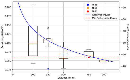 Parameter values such as a 4.0 GHz resonance frequency, 12 dBi interrogator antenna gain, 4.2 dBi sensor gain, and representative estimates for path loss, noise figure, and thermal noise were used in this calculation. The analysis predicted a maximum effective interrogation distance of approximately 800 mm, which aligned with experimental observations shown in Figure 15 and Figure 16. The high variation in sensitivity for datasets at 200 mm was due to difficulty maintaining time-gating isolation between crosstalk and antenna reflections at close range. Findings reported by Tennant et al. indicated by the three points labeled N-35, N-50, and N-75 in Figure 15, contradicted this work as they observed that sensitivity increased with distance [1]. Tennant et al. observed sensitivity values ranging from 22 to 62 , with sensitivity increasing as the interrogation distance increased from 350 mm to 750 mm [1]. Low sensitivity observed at a 350 mm measurement in their study may have resulted from the increased difficulty of time-gating at close ranges or from the decreased conductivity of the indium tin oxide (ITO) patch material used. Ma et al. found that sensitivity exponentially decays with distance [13], which aligns with the results found in this work. Cheng et al. showed sensitivity values of 0.41–0.58 for their 5.0 GHz patch antenna interrogated at a distance of 30 mm, though the distance between the interrogation antenna and the sensor was fixed [11]. The loss associated with low sensitivities could be mitigated by using higher-resolution readings, although this approach would inversely impact polling times.