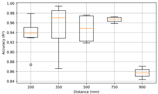 Accuracy varied significantly with interrogation distance. Broader antenna reception cones captured excessive background noise at 900 mm, pushing the signal closer to the noise floor and resulting in a noticeably lower score, as shown in Figure 16. The 900 mm datasets were excluded from training due to the significant degradation in received signal quality at that range, which resulted in noisy and unreliable measurements. Including these data points would have introduced distortions that impair model performance within the effective operating range of 200–750 mm. Measurements at 200 mm also exhibited low scores, largely due to difficulties in applying a precise time-gating window at such close range. The results highlighted the importance of optimal interrogation distance for accurate temperature estimation.