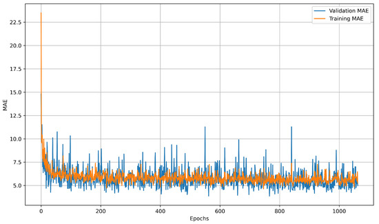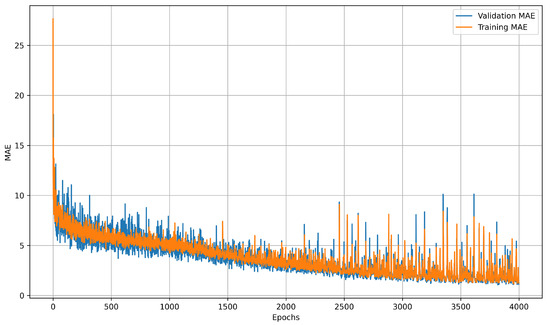 Learning curves illustrate how prediction error changes throughout training, offering insight into model convergence, generalization, and potential issues such as underfitting or overfitting. The training curve reflects performance on known data, while the validation curve measures accuracy on unseen data, with divergence between them often indicating overfitting. LSTM learning curves showed diminishing returns after 4000 epochs on the preprocessed collection of 28 datasets. MAE stagnated around 1.32 °C after the 3500-epoch threshold, as shown in Figure 17. The NN model plateaued much earlier, reaching minimal improvement beyond 200 epochs, as illustrated in Figure 18. These learning curves highlight the LSTM model’s capacity for continued refinement over extended training periods, while the NN model rapidly converged to its optimal performance.