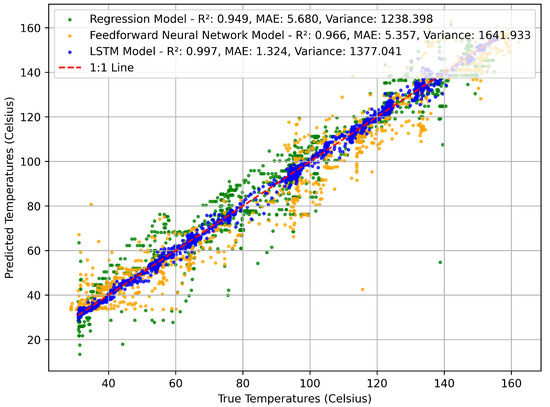 Each trained model was evaluated on a validation dataset to assess generalization performance. Model validation tested the models’ ability to make accurate temperature predictions on previously unseen data, providing a fair comparison of model architectures under realistic deployment conditions. LSTM outperformed all other tested model architectures in both MAE and . Each model’s performance when predicting the temperature is shown in Figure 19, where models with data points closer to the line of best fit provided more accurate estimates. The LSTM performed with an score of 0.997, while the traditional NN and LR models showed scores of 0.966 and 0.949 respectively. Higher variance in LSTM predictions does not imply inaccuracy, as the model still achieved superior correlation and lower average error. Temperature predictions were off by an average of 1.32 °C for the LSTM model, compared with 5.36 °C for the NN and 5.68 °C for linear regression. The LSTM model improved over linear regression by 76% in terms of MAE. The model demonstrates reliable performance within a temperature range of 20–170 °C, interrogation distances between 200 and 750 mm, and under heating rates below approximately 1.5 °C/s; conditions outside these bounds may lead to increased prediction error. The summarized results of each model are shown in Table 5. Comparisons between existing sensing technologies and the model are provided in Table 6.