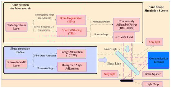 Unlike conventional static solar simulators compliant with ASTM standards, this study develops a high-precision dynamic solar radiation platform capable of faithfully replicating transient interference dynamics during Sun outage events. By innovatively integrating a multimode-fiber-apodizer homogenization system (achieving 85.8% far-field uniformity over a 200 mm aperture), power–spectrum co-optimized filtering (78% spectral matching accuracy), and BRDF-modeled stray light suppression (10−12 W background noise), we have successfully addressed critical challenges in ground-based Sun outage simulation. The system’s 50× dynamically adjustable power range (2.5–130 mW, ±0.9% error) and inherent engineering scalability fill a key technological gap in satellite communication anti-interference testing.
