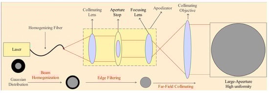 During the theoretical design phase, to ensure that the irradiance uniformity within the central region exceeds 90%, the optimal diameter range of the apodizing diaphragm D was determined to be between 15 mm and 40 mm. Within this range, high-frequency modal structures at the beam edges can be effectively filtered out, significantly improving spatial energy uniformity at the cost of a slight reduction in total transmitted energy. The specific dimensions of the apodizer used in the experimental setup are detailed in the following experimental section. The working principle of the homogenization structure combining the fiber and apodizer is illustrated in Figure 2.