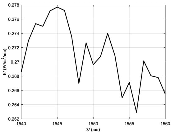 In a Sun outage interference simulation system, the spectral characteristics of the solar radiation background are among the core parameters determining the realism of interference reconstruction. To achieve high-fidelity reproduction of the solar spectral distribution within the communication band (1540–1560 nm), as illustrated in Figure 3, the light source must spectrally match the actual solar spectral radiance to ensure effective spectral-domain coupling between the signal and interference beams. However, conventional spectral filter design is typically based on static source spectra, which makes it unsuitable for handling the nonlinear spectral response of laser sources under varying power levels [27,28].