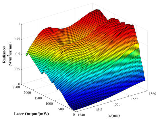 The filter transmittance curve was measured using a Shimadzu UV-3600 spectrophotometer (Shimadzu Corporation, Kyoto, Japan), with a spectral range of 185–3300 nm and a resolution of 0.5 nm. The shaped spectral distribution was measured using an ASD FieldSpec spectral radiometer (ASD Inc., Boulder, CO, USA), which covers a wavelength range of 350–2500 nm with a wavelength accuracy of ±0.5 nm. The laser output power was adjusted from 0 to 2 W in 50 mW increments, and the spectral radiance within the 1540–1560 nm band was recorded at each power level.