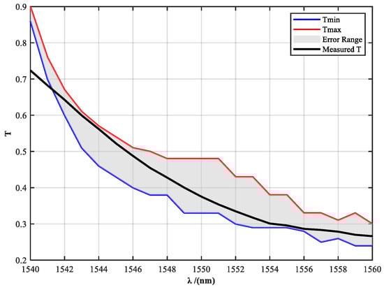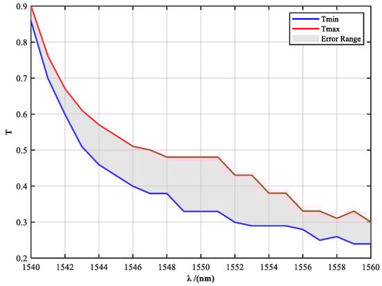 Figure 7 presents a comparison between the theoretical design curve and the measured transmittance of the filter. The shaded area indicates the theoretical tolerance band, accounting for fabrication deviations caused by multilayer coating thickness variations. The yellow curve represents the measured transmittance of the fabricated filter sample. It can be observed that at 1540 nm and 1541 nm, the measured transmittance slightly exceeds the upper tolerance limit, resulting in deviations from the intended spectral shaping at these wavelengths. This discrepancy is mainly attributed to the high precision required in controlling the transmittance at each wavelength point, which poses significant challenges in multilayer coating fabrication and spectral matching.