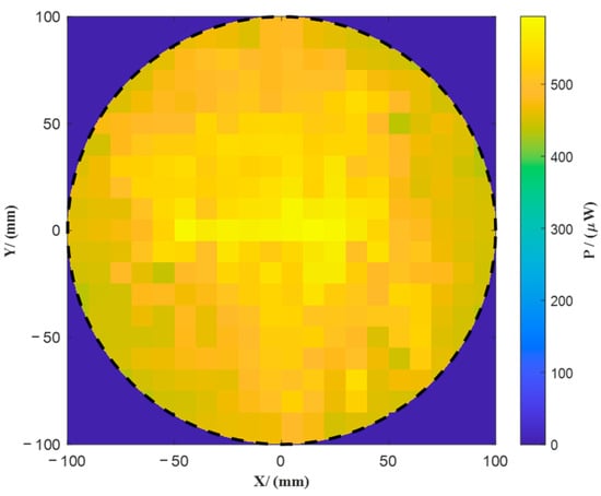 To quantitatively evaluate the far-field irradiance uniformity of the homogenization structure, a measurement setup was constructed as follows. A vertical detection plane was positioned at the output aperture of the solar illumination module. A Thorlabs PM100D digital optical power meter (detector model: S145C, with an active aperture of 11.8 mm and spectral response range of 800–1700 nm) was used for energy acquisition. The power sensor was mounted on a two-dimensional precision motorized translation stage. The scanning area covered a circular region with a diameter of 200 mm, and the sampling step size was set to 10 mm in both the x and y directions to obtain the irradiance distribution over the plane.