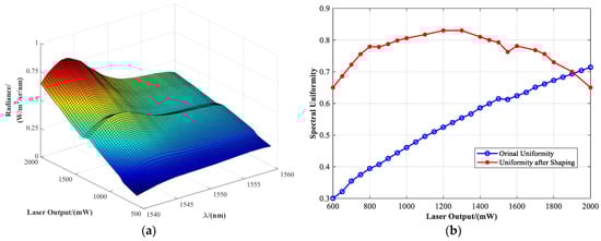 Figure 8a shows the system’s spectral radiance distribution after spectral shaping by the designed filter, covering an output power range of 600–2000 mW. Compared to the original laser output (Figure 4), the shaped spectrum exhibits significantly improved smoothness with reduced fluctuation amplitude. The spectral consistency is notably enhanced within the typical working power range of 750–1750 mW.