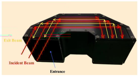 To reduce energy leakage from secondary stray light paths caused by multiple reflections within the system cavity, a U-shaped reflective light trap was designed. The structure utilizes highly absorptive inner wall materials and an extended reflective geometry to achieve structural suppression of background illumination. The fabricated prototype and main light tracing principle, shown in Figure 12, has been assembled and demonstrates good engineering feasibility. As shown in the simulation results (Figure 13), the stray light power from secondary paths is reduced from 1.0 × 10−7 W to 5.13 × 10−12 W after introducing the light trap, achieving more than five orders of magnitude of attenuation. This confirms the effectiveness of the design in suppressing background leakage under high-interference conditions.