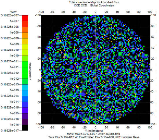 For the solar illumination module, as shown in Figure 9a, the primary solar beam power is 130 mW. The main stray light caused by specular scattering paths accounts for approximately 2 × 10−4 W, while secondary stray light arising from multiple internal reflections within the enclosure contributes about 1 × 10−7 W. The signal light module, as shown in Figure 9b, delivers an effective communication signal power of approximately 9.6 × 10−11 W, with its own stray light component as low as 1.64 × 10−15 W, which is negligible relative to the signal power.