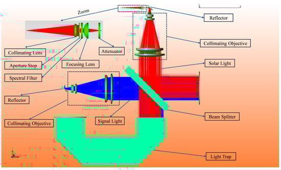 Table 3 summarizes the primary sources of stray light at the system output aperture and their corresponding energy proportions. The results indicate that the dominant source of stray light originates from specular scattering on the reflective surface of the beam splitter, accounting for 99.95% of the total stray light. The secondary transmission path, formed by solar radiation transmitted through the beam splitter into the internal cavity and subsequently reflected multiple times, contributes only 0.05% of the total stray energy. However, despite its relatively small proportion, the absolute energy level of this secondary path is significantly higher than that of the signal power and therefore cannot be neglected.