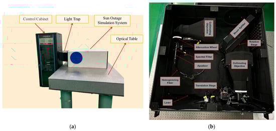 Physical diagram of Sun Outage Simulation System: (a) Appearance of testing system; (b) inside testing system.