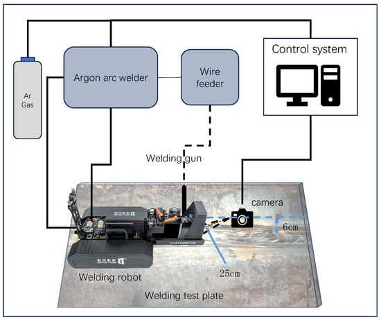 As shown in Figure 2, this study uses the same melting pool vision system as [22]. The molten pool vision system comprises a molten pool camera, a trackless crawling welding robot, and an industrial control computer. The molten pool camera captures videos at a pixel resolution of 640 × 512 with a frame rate of up to 640 FPS. It is controlled by the industrial control computer, allowing for flexible recording. All experiments were conducted on a GMAW welding system.