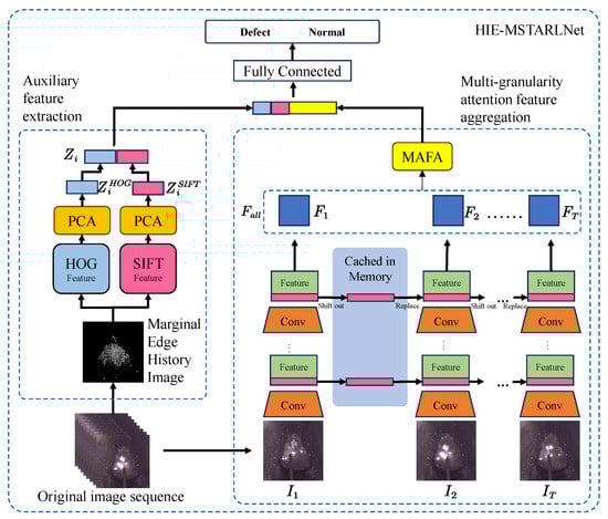 This section presents HIE-MSTARLNet, our novel framework that fuses long-term handcrafted spatial cues with a unified multi-granularity attention mechanism to achieve efficient, interpretable spatiotemporal feature learning. Compared to the defect detection model [22] based on multiscale feature fusion for melting pool videos, HIE-MSTARLNet makes several improvements by adding long-term spatial structural features (handcrafted features) extracted from edge history images, replacing the cascade structure of multiscale feature fusion and hybrid attention mechanisms with a multi-granularity attentional feature aggregation model, incorporating the selection of key unobstructed frames, and introducing an attention-based fusion layer to enhance the integration of deep and handcrafted features. The input is consistent with the defect detection model based on the multiscale feature fusion of melting pool videos, which processes the video sequence as input. The video sequence can be represented as , where N is the batch size, T is the time dimension, C is the number of channels, and H and W are the spatial dimensions.