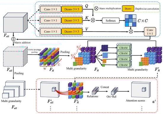 Finally, and are divided into n channel groups and pooled at multiple spatial resolutions () to capture multi-granularity representations. Each group passes through CBAM to compute attention maps, which are concatenated with the original features and fed into a convolutional fusion layer to generate an attention score vector (). These scores are normalized and used to aggregate the corresponding feature groups as follows: