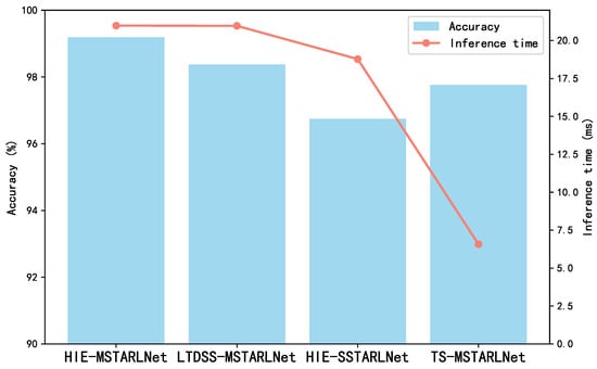 From the figure, it can be seen that all three auxiliary enhancement tools, TSM, MAFA, and LDSSI, contribute to the performance of the model, and among them, TSM and MAFA contribute to a greater extent than the LDSSI auxiliary enhancement tool (i.e., TS-MSTARLNet has higher accuracy than the LTDSS-MSTARLNet model and the HIE-SSTARLNet model on the self-constructed dataset). The LTDSS-MSTARLNet model has higher accuracy than the HIE-SSTARLNet model on the self-constructed dataset, where MAFA contributes to a greater extent than the TSM (i.e., the LTDSS-MSTARLNet model has higher accuracy than the HIE-SSTARLNet model). However, both the MAFA module and the LDSSI-assisted enhancement tool significantly increase the inference time, whereas the TSM, being a plug-and-play module, adds little to no inference time. Among them, the MAFA module increases the inference time related to the number of its granularity levels, so it is important to minimize the granularity levels to reduce the inference time while satisfying high accuracy.