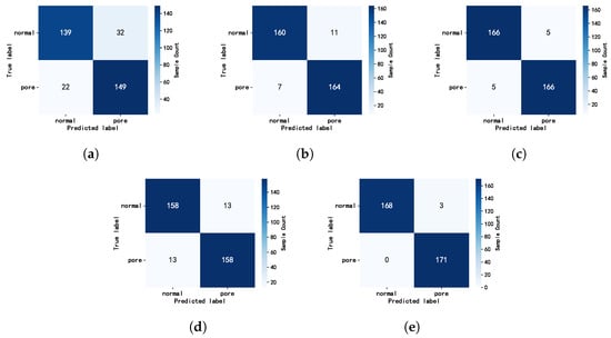 To further analyze the model’s classification ability for different welding states, we select the optimal model from each of the five classes of methods (static image-based methods, RNN-based methods, 3D-CNN-based methods, pixel-level methods based on image fusion, and feature-level methods based on image fusion) and draw a normalized confusion matrix based on the classification results of the test set, as shown in Figure 8.