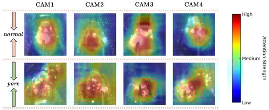 To further illustrate the interpretability of the proposed HIE-MSTARLNet model and to intuitively highlight its decision-making process in weld defect identification, we utilized class activation mapping (CAM) visualization. Specifically, molten pool images from four representative cases (CAM1–CAM4), covering both normal and porosity-defect scenarios, were selected for visualization, as shown in Figure 9. The first row corresponds to normal molten pools, and the second row corresponds to pools exhibiting porosity defects. The CAM results indicate that the model primarily focuses its attention on the central region of the molten pool surface, specifically the molten metal region below the welding wire. This central area exhibits notable variations in texture patterns and light spot distributions between normal and defective states, as opposed to solely relying on the outer contours of the molten pool, which has traditionally been the primary focus of previous studies. Notably, our visualizations also indicate that spatter around the molten pool is one potential interfering factor that might lead to misclassification. In practical industrial applications, these visual insights can effectively guide weld quality control by allowing operators and engineers to observe and understand critical discriminative features associated with defects directly. For example, noticing subtle differences in the highlighted central region may facilitate timely parameter adjustments or welding wire changes before significant defects occur. Thus, these CAM visualizations not only enhance the interpretability of the proposed model from a theoretical perspective but also offer actionable insights for industrial deployment, thereby bridging the gap between theoretical advances and real-world welding quality management.