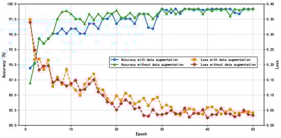 The HIE-MSTARLNet model is first trained using MEHI images and raw sequence images, and the process is shown in Figure 10. It can be seen that the model trained based on the data after data augmentation exhibits more stable accuracy after convergence, although it converges more slowly than the model trained based on the original data. Moreover, the overall stability of the model improves significantly after data augmentation, and its performance stabilizes after about 35 epochs. To prevent overfitting, an early stopping strategy is used, where the number of training rounds is set to 10 rounds, and the model stops training at 42 rounds, so the model with 42 training rounds is used as the final model of the HIE-MSTARLNet model using MEHIs for the subsequent study.